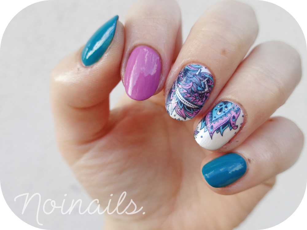 Ennél az ívnél a türkizkék és a lila szín dominál az alsó és a felső részben is. A színek hasonlóak, de mégsem illenek egy manikűrbe, így ismét kettő készült.